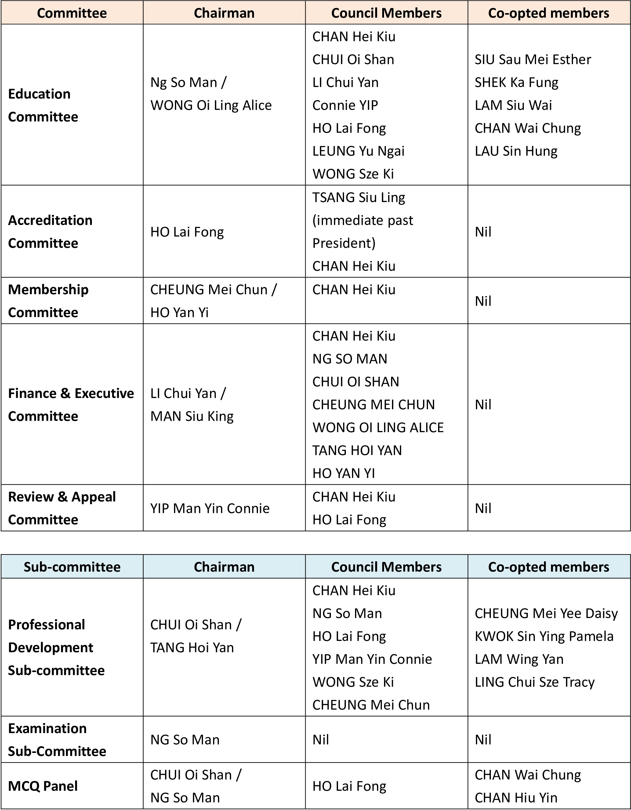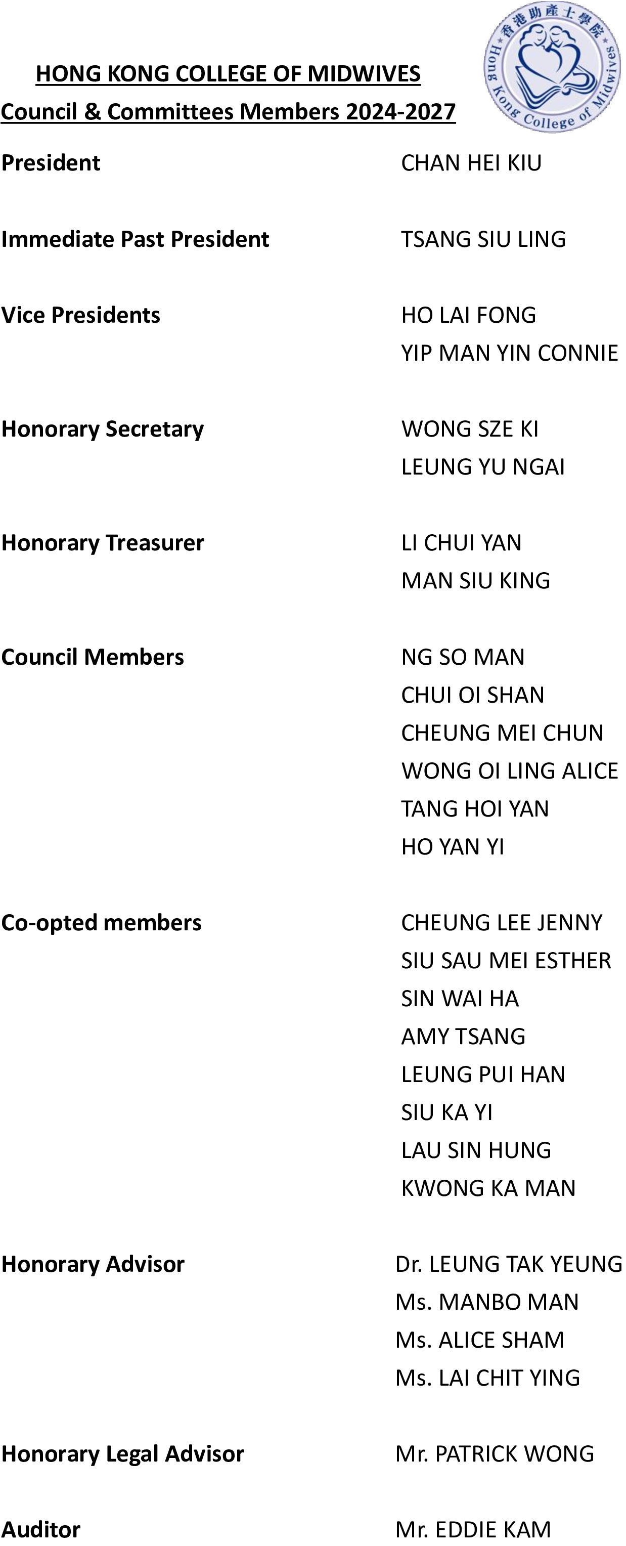 The Hong Kong College of Midwives was founded by Ms Alice SHAM, Ms Manbo MAN, Ms Irene LEE, Ms Florence HAU, Ms Iris LAM, Ms Rita YUEN and Ms POON Miu Ho. With tremendous advice and support by O&G, Midwifery and Nursing colleagues, the College has been established for one year now. Other than the 5 Office Bearers and 8 Council members, 10 Fellow members had been invited to join the Council as co-opted members after the Fellowship conferment in May 2012. Under the Council, there are 4 committees, each with their terms of reference clearly delineated; namely Fellowship Selection Committee, Finance& Executive Committee, Education Committee and Review Committee.
